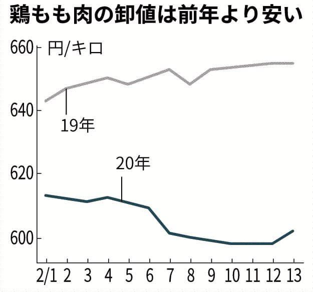 水炊きや鶏団子などに使う鶏肉(東京市場、もも肉)の2月…