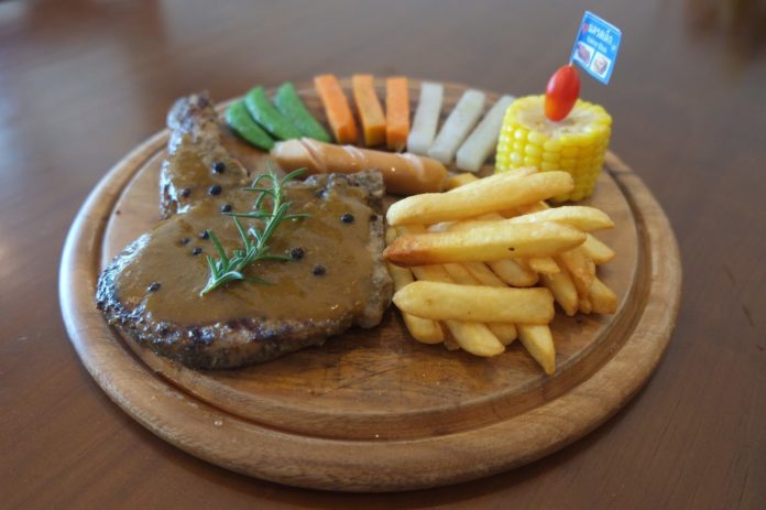 ใส่ความหวานจากหอมใหญ่ย่าง โรยด้วยเกลือ พริกไทย และมีผักกาดแก้วสดๆ รองชิ้นเนื้อ