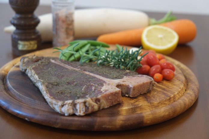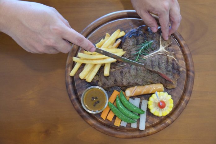 เมื่อลูกค้าสั่งก็ตั้งเตาด้วยไฟอ่อน ย่างก้อนเนื้อที่เตรียมไว้ ลงเนยเพิ่มความหอม ปรุงรสด้วยเกลือและพริกไทย