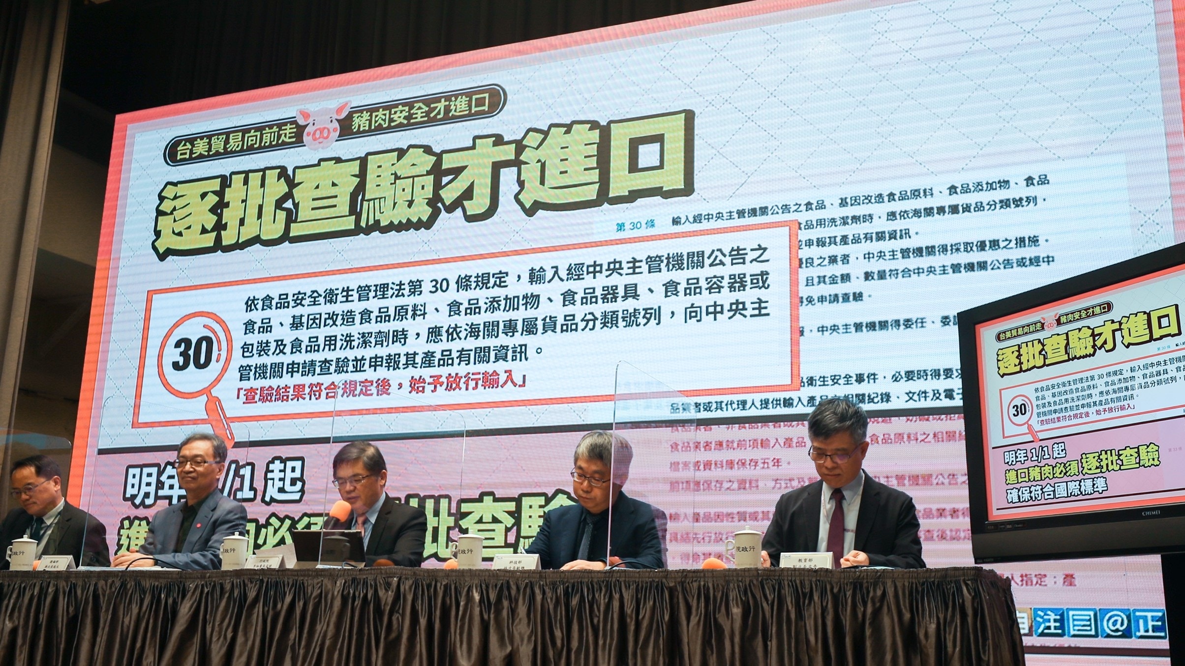 台灣行政院11月26日舉行院會,蘇貞昌在會中指出,為了消除食安疑慮,此次頒佈的「進口豬肉全方位管理措施」將嚴格把關,具體內容包括赴美查廠、新增貨號、逐批查驗、清楚標示、嚴格稽查。