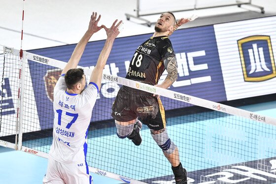 | OK금융그룹 펠리페가 13일 삼성화재와의 경기에서 공격을 시도하고 있다.(KOVO 제공)© 뉴스1 |