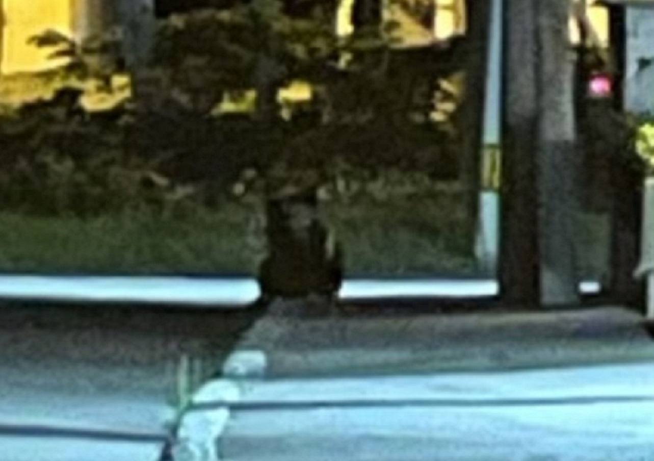 歩道に座り、様子をうかがうクマのような動物。この写真は7月9日、札幌市南区真駒内南町4丁目の路上で、通りがかった男子高校生が撮影しました。